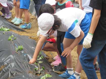 今日は、スマイル班ごとにサツマイモの苗を植えました。これから班の仲間と協力して育てていきます。