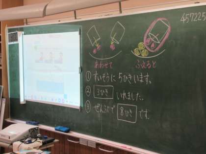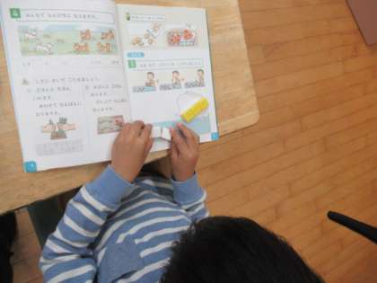 「あわせていくつ、ふえるといくつ」お話に合わせてブロックを動かしながら考えています。