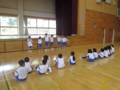 遊び係がみんなの前に立って、司会をしたり、ルールを説明したりしました。みんなで楽しく活動することができました。