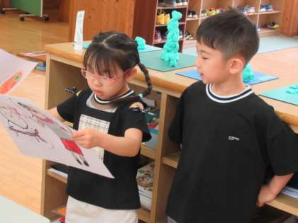 来週行われるスマイル班遠足の中で、1年生の自己紹介の時間が設けられています。1年生の子供たちは、自分のことを知ってもらおうと、好きな食べ物やキャラクターをまとめました。全校の前で、しっかり紹介できるように、何度も伝える練習をしていました。