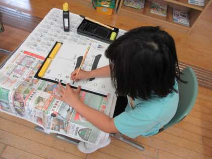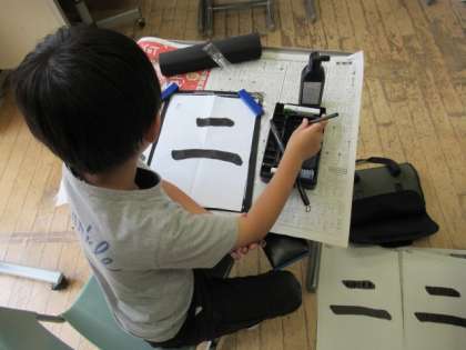 筆の入りに気を付けて練習しています。手本をよく見て書きましょう。