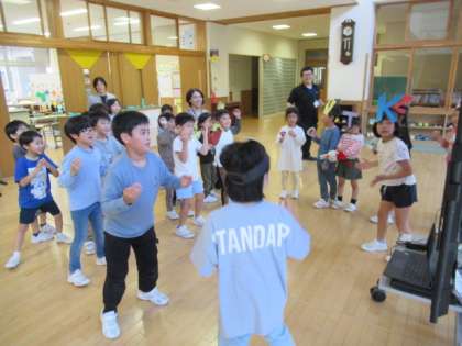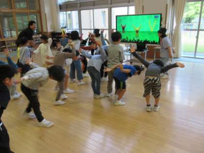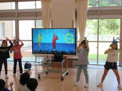 1〜3年生が合同で集会を企画しています。今日は、体育係からの提案で、ダンスを行いました。みんなで体を動かして、楽しんでいました。