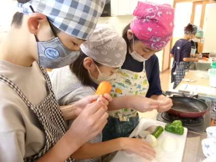 5年生は、青菜のおひたしとゆでいも、6年生は、野菜炒めをつくりました。包丁でのジャガイモの皮むきは予想以上に難しく、ピーラーの便利さを実感した子供たちでした。