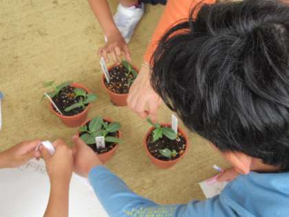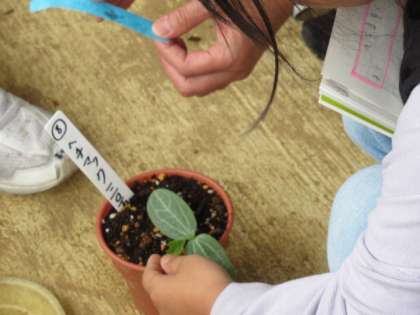 以前に植えたヘチマがどんどん大きくなってきました。長さを測ったり、葉の手触りを確かめたりしながら、ヘチマの生長を確かめる子供たちです。