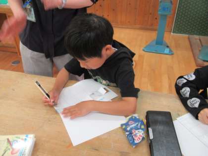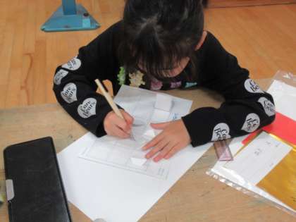 今回の活動には、カッターナイフを使います。今日は、カッターナイフを使って紙を切ってみました。最初は危なっかしい手つきでしたが、次第に慣れてきたようです。