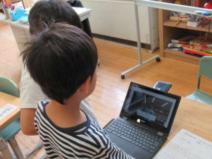 学校探検で分かったことを、今度はレポーターになって伝えます。今日は、自分の伝える姿を端末で録画して確かめました。