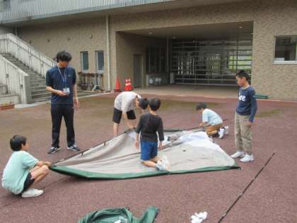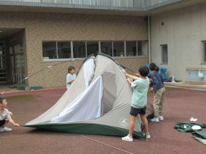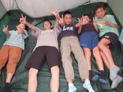 5,6年生は、2学期に宿泊学習を行います。今回は、自分たちの生活を自分たちの手でつくることをめあてに、生活する場所も宿泊棟ではなく、テントにして活動します。今日は、自分たちの手でテントを張ってみました。試行錯誤しながら、ようやくできたテントの中で満足そうな子供たちです。