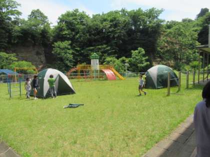 休憩時間を利用して、テントを張る練習をしていました。昨日よりもずいぶん手際よく進めていました。