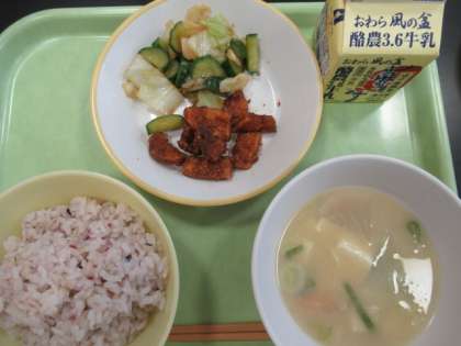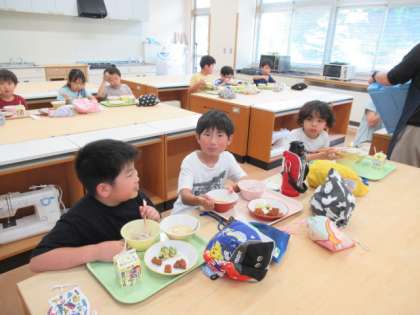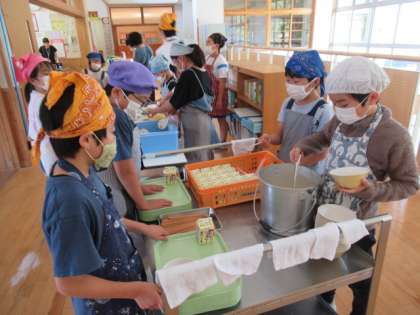 今日は、1年生の親子給食でいつもの部屋を使用するため、2〜6年生は別の場所で食べました。
