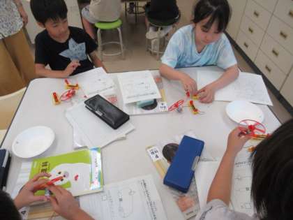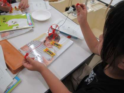乾電池二つを、いろいろなつなげ方でつないでみます。何か違いは起きるかな。