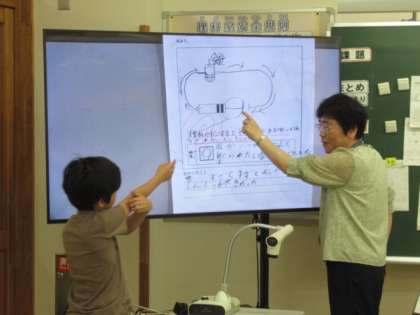 回路を流れる電流について考えています。自分のかいた図を基に、友達に説明していました