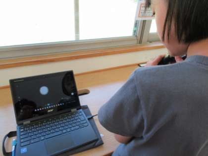 顕微鏡を端末につないで、葉の気孔を観察しました。