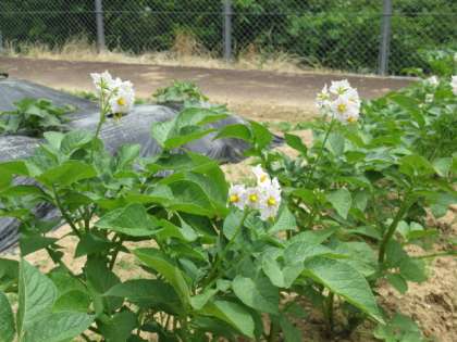 2年生の畑では、今、いろいろな野菜の花が見られます。ジャガイモ、トマト、スイカ等、どんどん育つ野菜を見て、子供たちのお世話にも力が入ります。