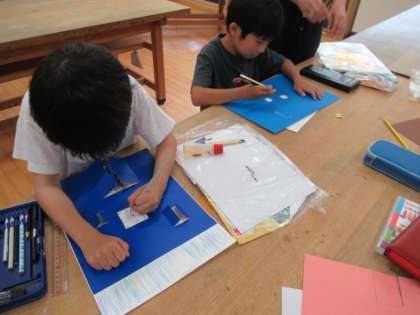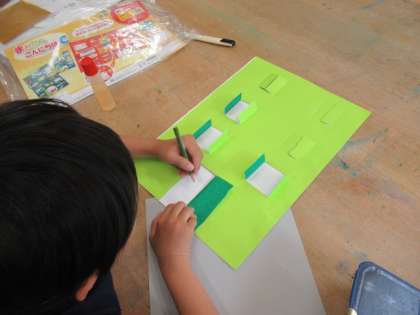 「まどからこんにちは」の作品に取り組んでいます。窓を開くと、何が出てくるのでしょうか。子供たちは、想像をふくらませながら楽しんでいます。