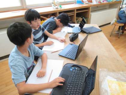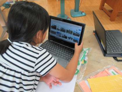 「未来の富山市」の絵を描こうと、富山市をイメージできるものを探していました。どんな作品が仕上がるかな。
