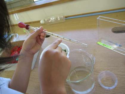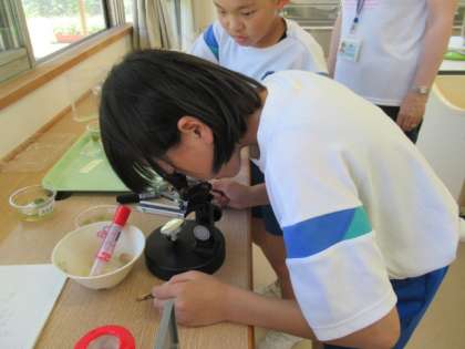 水中の小さな生物を観察しました。解剖顕微鏡をのぞくと、小さな動くものが・・・。