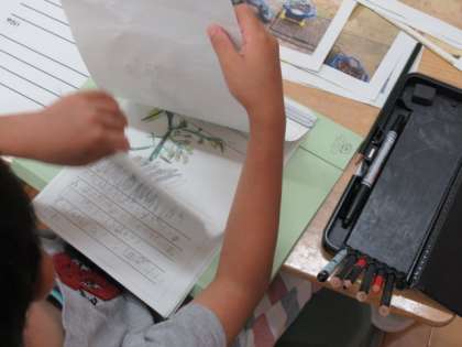 これまでの野菜づくりを振り返り、野菜の様子について確かめていました。始めの頃の写真と今の野菜の写真を比べることで、自分たちが働きかけてきたことへの手応えを感じているようでした。
