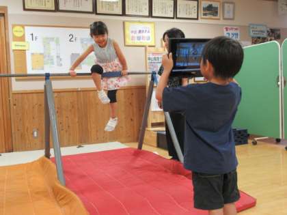 学校探検で見付けたことを伝えるために、端末で録画して確かめています。友達と協力する姿が見られます。