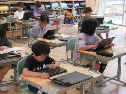 漢字ドリルのまとめに取り組んでいます。ドリルが終わった子供は、端末で自分に応じた学習に取り組んでいます。
