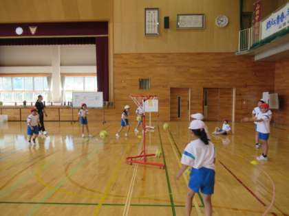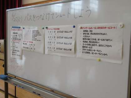 パスをつないでシュートするゲームに取り組んでいます。限られた時間の中で正確にシューを決める力も必要です。子供たちは、どうやってシュートするとよいかをいろいろ試していました。