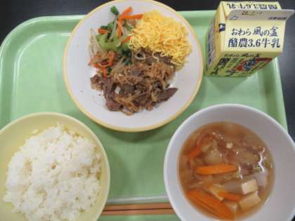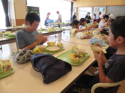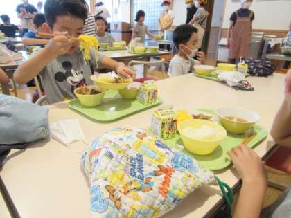 今日の給食のビビンバは、子供たちに大人気。たくさんの具材をご飯にのせて、おいしそうに食べていました。