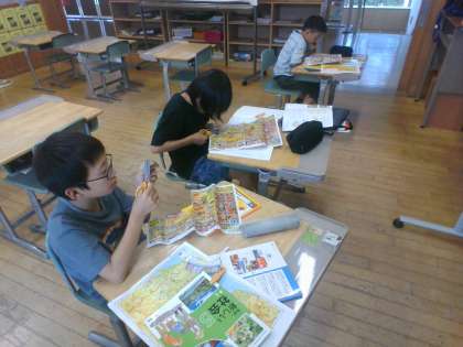 どこの県、国から食べ物がやってくるのか広告で調べ、白地図にまとめました。