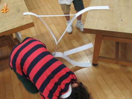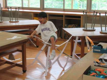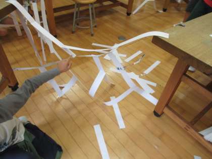細長い紙をつないで、不思議なオブジェを作っています。いつの間にか、紙に引っかからずに通ることができるか勝負が始まっていました。