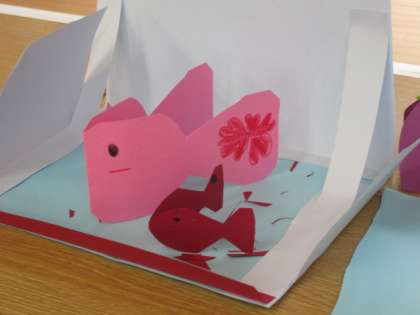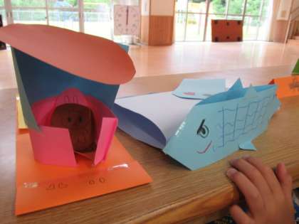 1年生の教室に行くと、1限目につくっていた作品が飾られていました。子供たちは、作品の物語を話してくれました。
