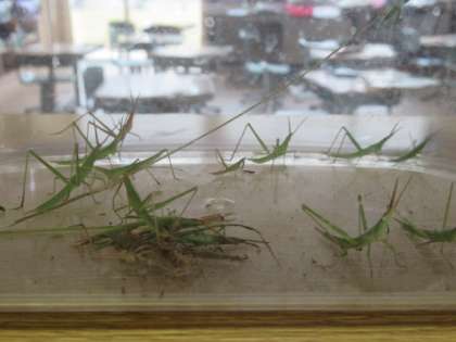 運動広場で、ショウリョウバッタを見つけた子供たち。虫かごに入れたら、こんな状態になりました。