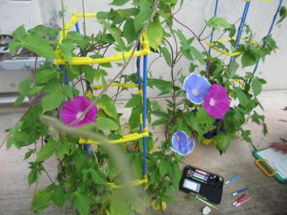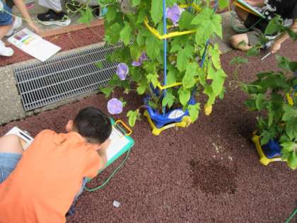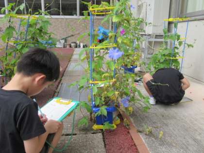 アサガオの花がたくさん咲きました。いろいろな色のアサガオ。観察している子供たちも楽しそうです。