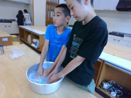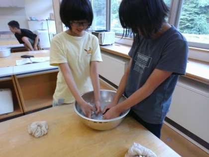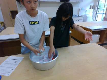 手洗い洗濯に挑戦しました。揉み洗い、つまみ洗、すすぎ等、ていねいに洗濯しました。これで、家でも自分の汚したものを手洗いできそうです。