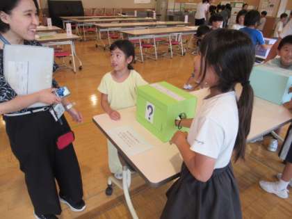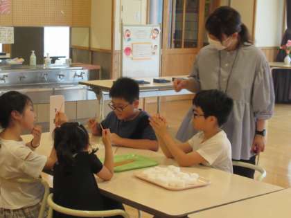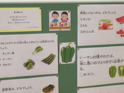 ワークショップでは、正しい箸の持ち方体験、食に関するクイズ、触って当てる野菜クイズ等の企画に取り組みました。はじめは、正しく箸を持つことが、なかなか難しいように見受けられました。でも、少し練習すると、多くの子供たちが正しく箸を持つことができました。今日をきっかけに日々意識していきましょう。