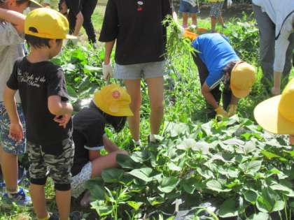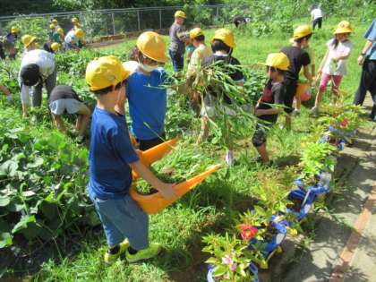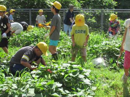 先日からの雨で、雑草がぐんぐんのびました。今日は、縦割り班で植えたサツマイモ畑の草むしりに取り組みました。