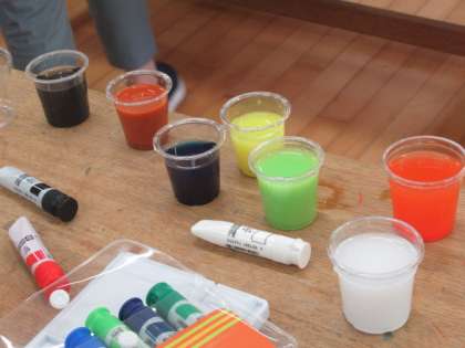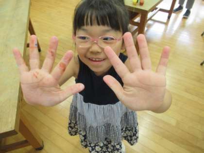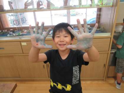 いろいろな絵の具を使って、きれいな色水ができました。同時に、自分の手までカラフルに。