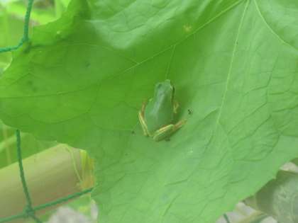 日中は暑いですが、朝の空気はひんやりとして、川のそばを歩くと、風が涼しく気持ちよかったです。ヘチマの葉の上にいたカエルも気持ちよさそうでした。