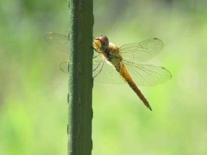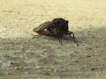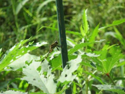 今日も、たくさんのトンボが飛んでいました。セミが柱の陰で休んでいたので、正面から撮ろうとしたら、体の向きを斜めにしました。こっち側から撮ってほしかったのでしょうか。