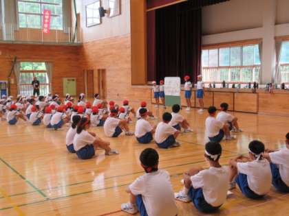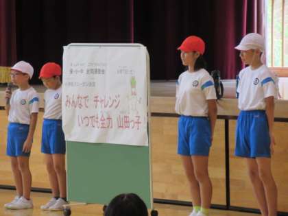 小中合同結団式を行いました。中学生の立派な姿が、子供たちにとってよい手本となっています。