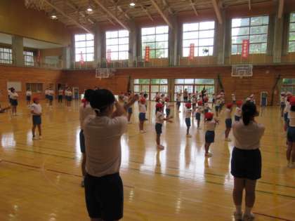 小中合同で、ラジオ体操の練習を行いました。担当の先生から動きのポイントを聞き、意識しながら取り組んでいました。