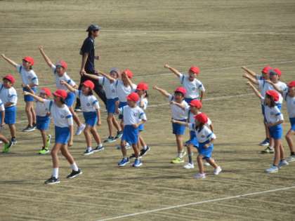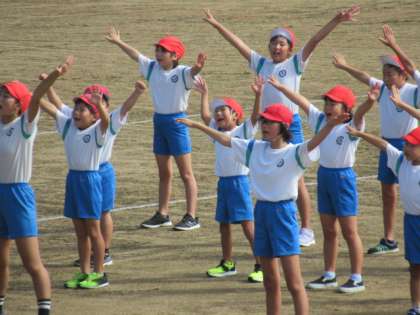今日はグラウンドでの応援練習です。赤団の力強い声がグラウンドに響いていました。
