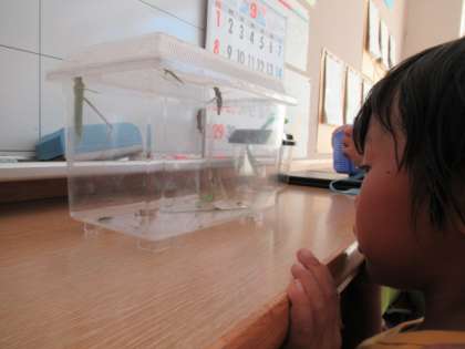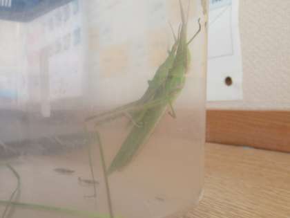 つかまえたバッタを眺める子供たちです。大きなバッタをつかまえていました。