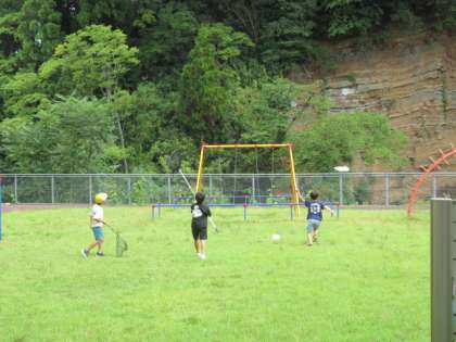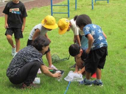 「〇〇となかよし」子供たちは、広場でバッタやトンボをつかまえようと頑張っています。