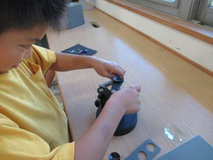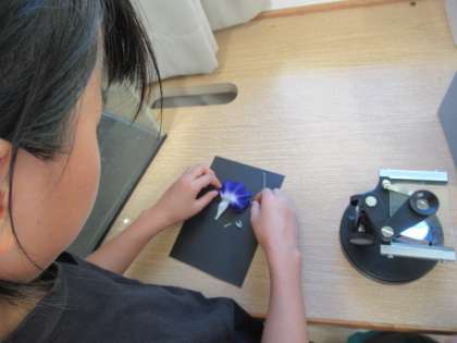アサガオの花のつくりを観察しています。最後の写真は、解剖顕微鏡のレンズ越しに撮影したものです。