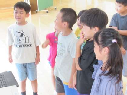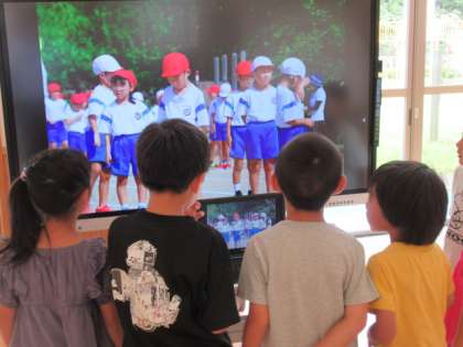 運動会のときの様子をスライドショーで映しています。子供たちは、友達の姿や自分の姿が映ると、うれしそうに声を上げます。みんな、運動会頑張りましたね。