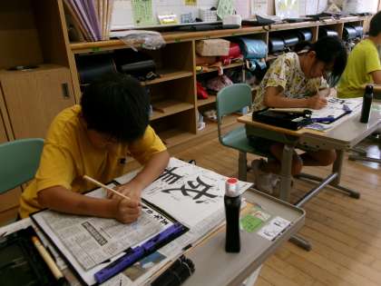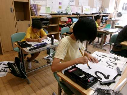 5年生は、筆順と字形に気を付けながら「成長」、6年生は、点画の間をつなぐ気持ちで「ひまわり」を書きました。一画一画集中して書きました。