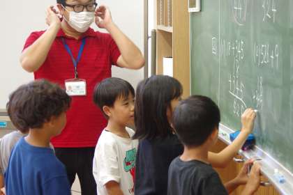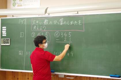 大きな数の筆算の仕方について考えていました。黒板の所に集まって、友達の話を聞いています。