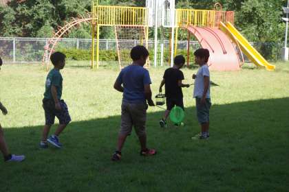 こおろぎ捕まえ隊が、網を持って畑に向かいます。