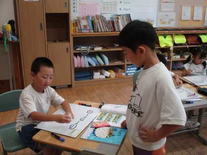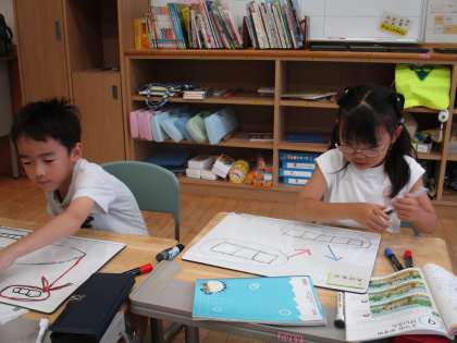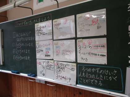 「3つのかずのけいさん」について、どのような式や図で表すか、一人一人が考え、話し合いました。