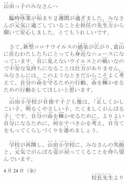 56名の山田っ子のみなさん、元気に過ごしていますか。校長先生からのメッセージを本ホームページの配布文書に掲載しました。ご覧ください。