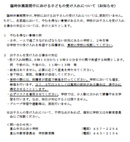 富山市教育委員会から、臨時休業期間延長(5月31日まで)の通知がありました。本ホームページの配布文書欄に、臨時休業期間の延長のお知らせを掲載しました。確認してください。