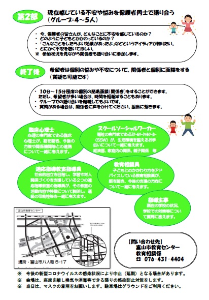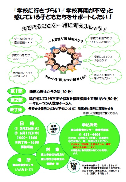 新型コロナウイルスの感染拡大により、先行きの見えない状況が続いております。子供たちを取り巻く環境も大きく影響を受けており、学校再開に向け期待もあれば不安もあるのではないかと思います。そういった子供をもつ保護者の皆さんが、気持ちを共有し、今後の子供とのかかわりに見通しをもつため、5月26日(火)と6月11日(木)の午後2時から、富山市教育センターにて、「思いを語り合う場」を設けます。詳しくは、本ホームページの配布文書にリーフレットを掲載しました。ご覧ください。